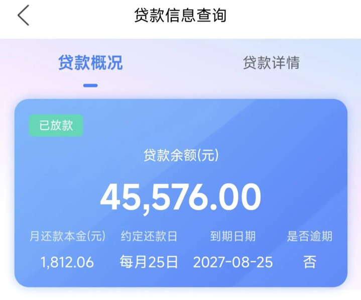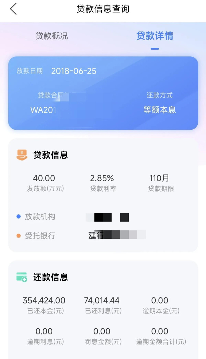 这两天我查询了一下,我们已经还了本金35万多,利息7万多,目前贷款还剩4万5。