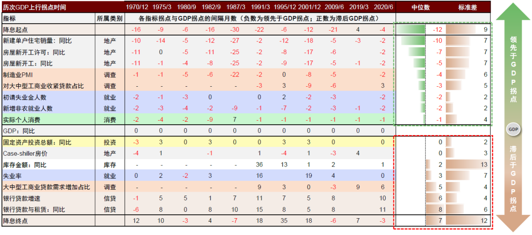 *注:图中的数字为历次降息推动的增长周期拐点中,各项指标拐点与GDP同比的上行拐点之间间隔的月份数,负数代表指标拐点出现在GDP同比的拐点之前,正数代表指标拐点出现在GDP同比的拐点之后;我们将各项指标从上到下按照相对GDP拐点“领先-滞后”的顺序依次排列