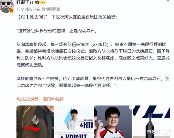 值得一提的是,这次LPL的奖杯很有意思,那就是学习了石油杯,加入了宝石底座的玩法,队长会携带宝石,被淘汰之后,队长会亲手交出宝石,然后宝石会插入奖杯,最后冠军队长拿到所有宝石之后,直接就会点燃冠军奖杯,还是挺有仪式感的。